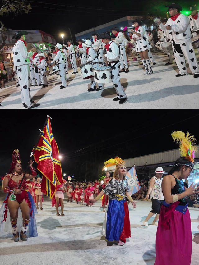 El desfile se desarrolló sobre la avenida principal y contó con la participación de distintas comparsas barriales que desplegaron creatividad y compromiso comunitario. Salgueiro, del barrio Henter, presentó “Héroes de Malvinas”; Candombe del Caribe, del barrio Malvinas, desfiló con “La Tierra Sin Mal”; Los Tigres, del barrio Belgrano, llevaron a escena “Intensamente: el carnaval de las emociones”; Basar, del barrio Sarmiento, recreó “La historia de la Isla Caraguatay”; y Copacabana, del barrio Guatambú, hizo vibrar al público con “Los Vaqueros”.