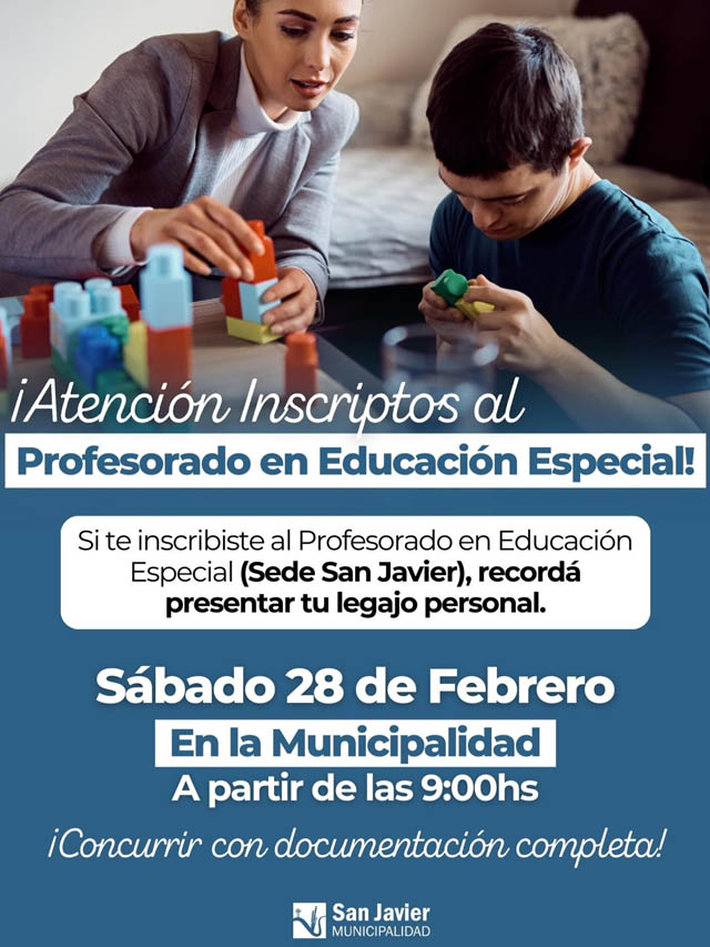 AGENCIA MISIONES.UNO | La Municipalidad de San Javier informó que los inscriptos al Profesorado en Educación Especial, sede San Javier, deberán presentar su legajo personal este sábado 28 de febrero.