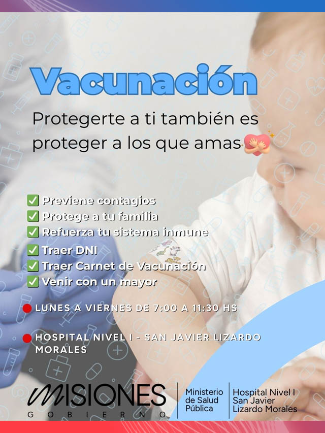 AGENCIA MISIONES.UNO | El Ministerio de Salud Pública de Misiones recordó a la comunidad de San Javier la importancia de vacunarse para prevenir enfermedades y proteger a la familia. La atención se realiza de lunes a viernes en el Hospital Nivel I San Javier “Lizardo Morales”.